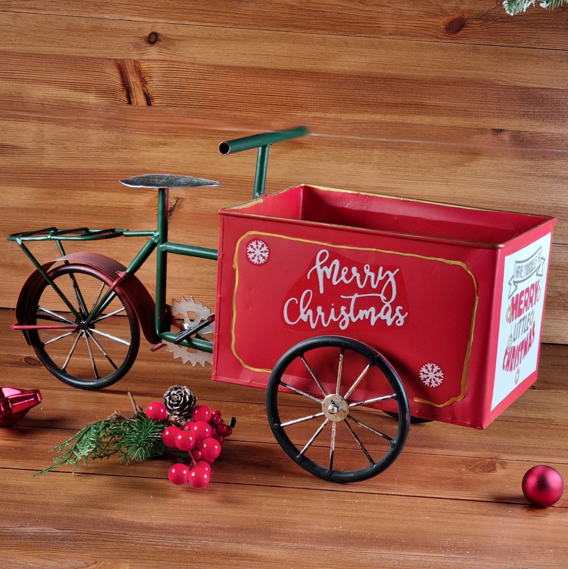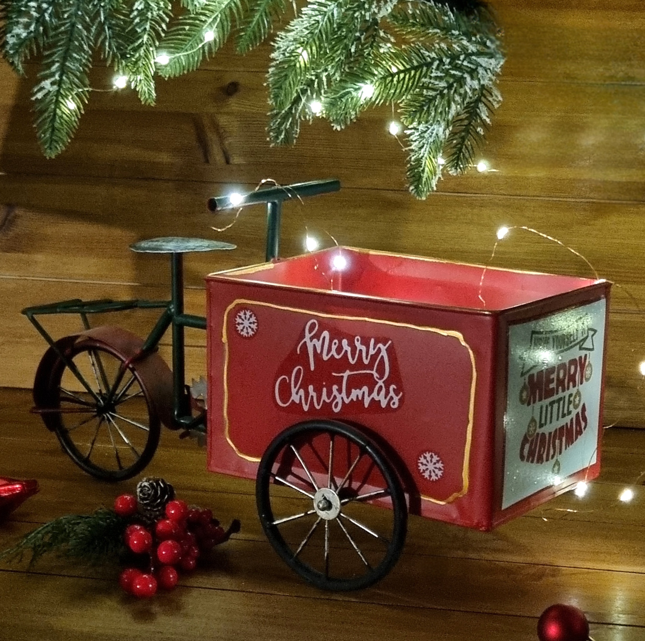 Ezt az egyedi, fém triciklit látva mindenki azonnal karácsonyi hangulatba kerül! A „Merry Christmas” felirat és a piros-zöld színek azonnal a karácsony varázslatos világába repítenek. Használjátok dekorációs elemként a polcon, az ablakpárkányon vagy a bejárati ajtó közelében, és töltsétek meg a rakodó részt ízlés szerint. Tegyél bele apró ajándékokat, karácsonyi gömböket, tobozokat, vagy akár egy kis cserepes növényt, és máris kész a tökéletes ünnepi kompozíció! Tartós fém anyagának köszönhetően hosszú évekig a karácsonyi dekorációtok kedvenc darabja lesz.