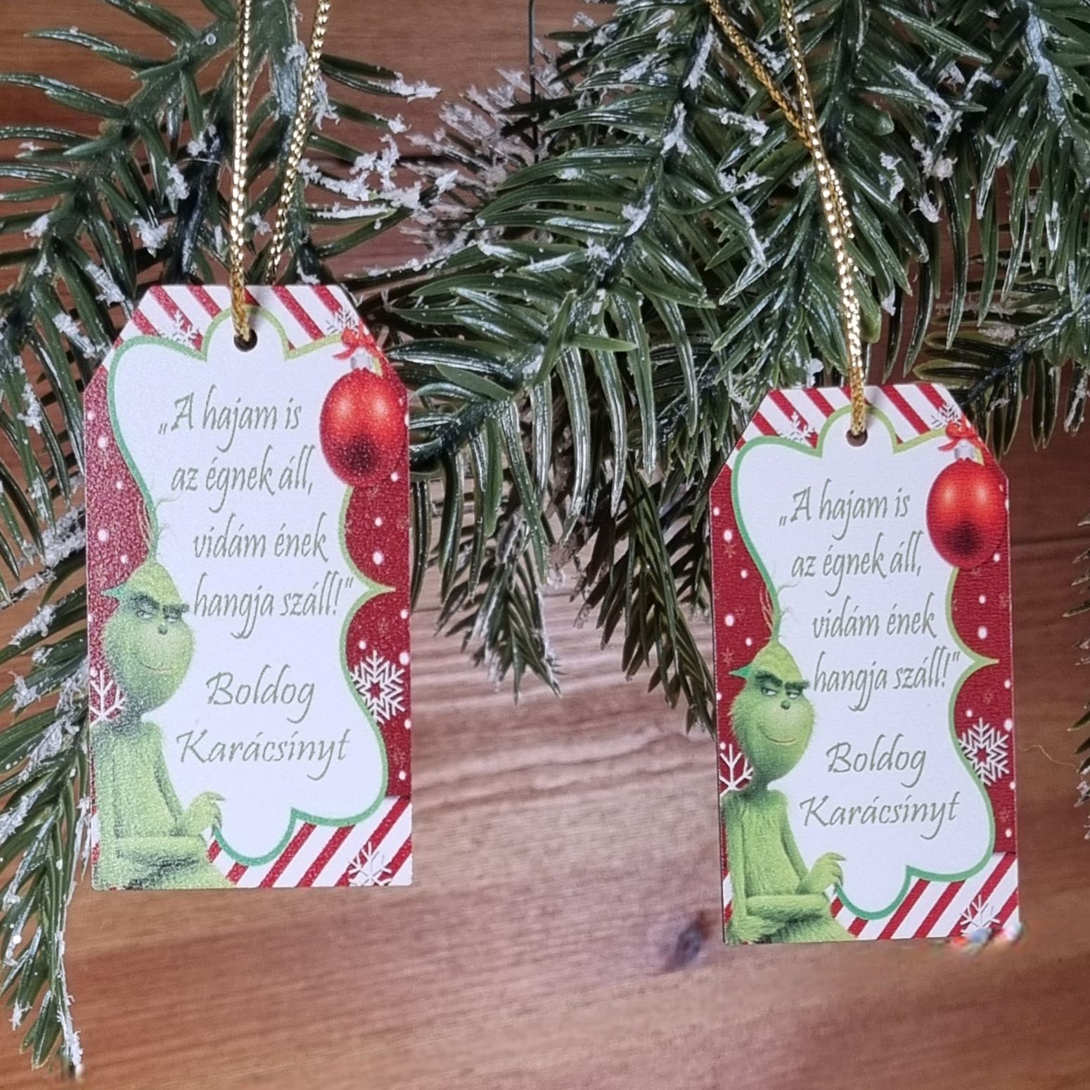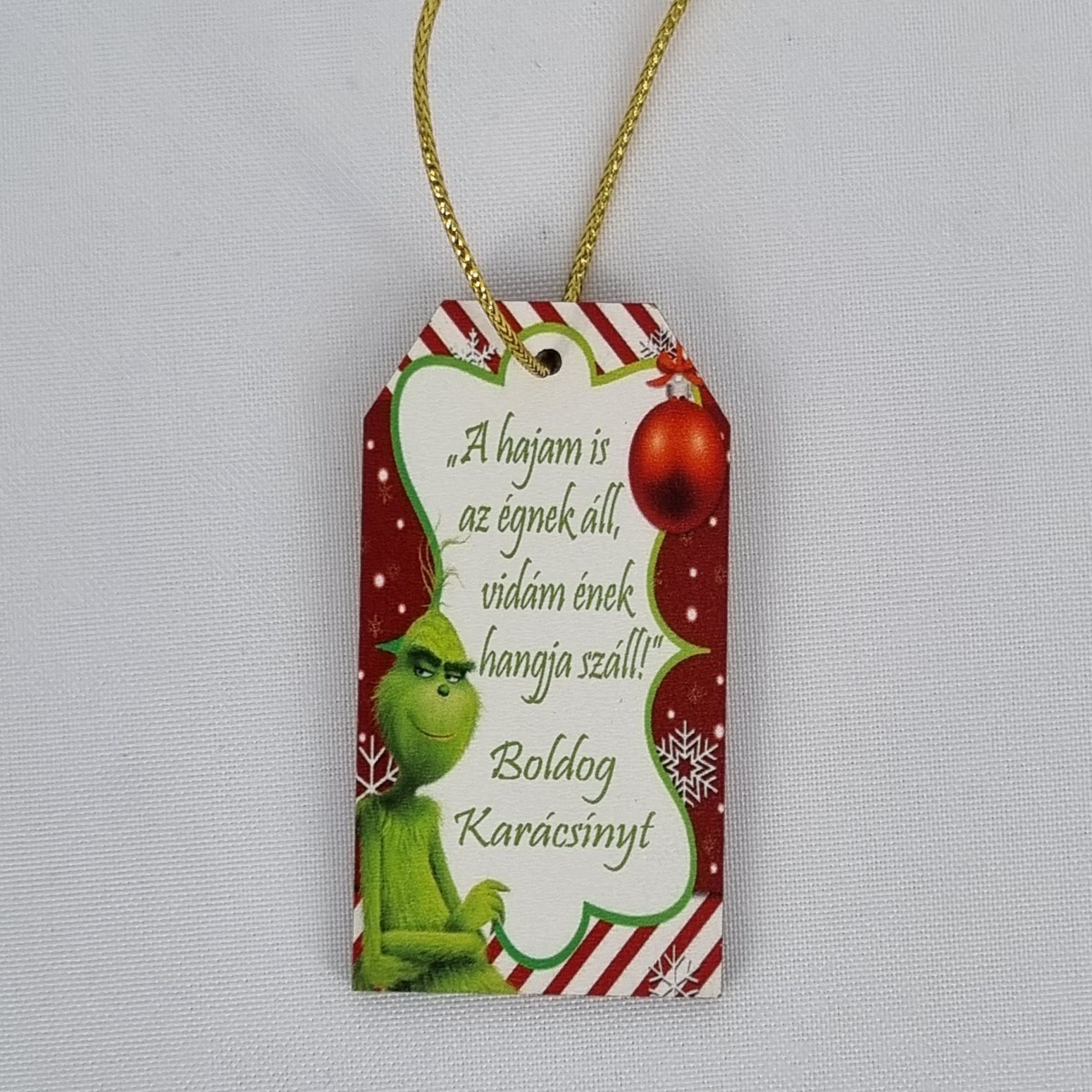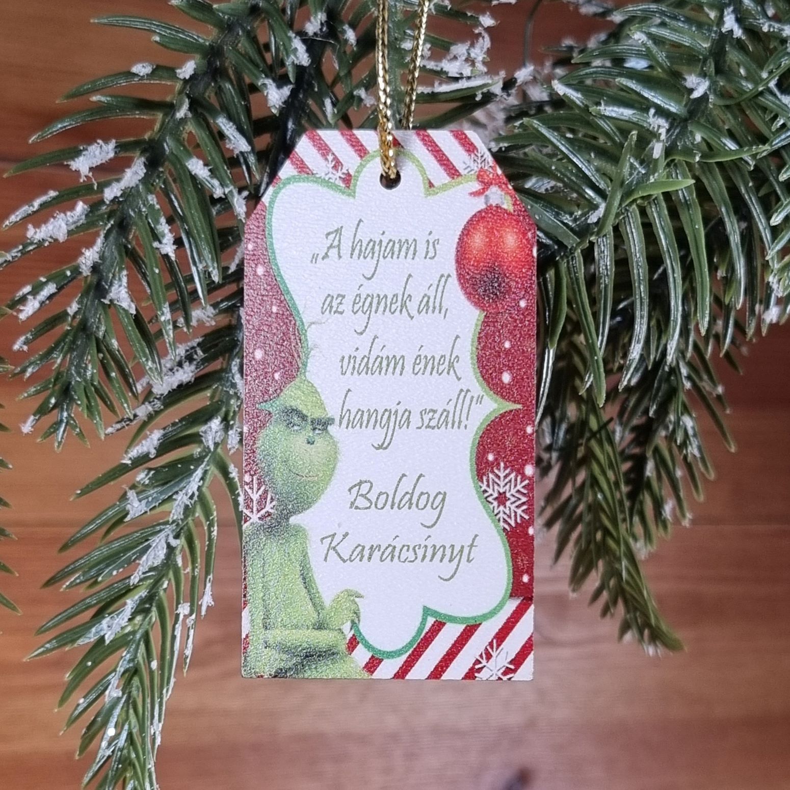 Leírás: Aki ellopta a karácsonyt… és a szívedet! Grincs karácsonyi akasztóImádod a Grincset? Akkor ez a neked való dísz! Ez a bájos, Grincs mintás, akasztós fa tábla a „A hajam is az égnek áll, vidám ének hangja száll!” felirattal remek kiegészítője lesz a karácsonyi dekorációnak. Akár ajándékkísérőnek is használhatod, hogy egyedi módon fejezd ki a jókívánságaidat. Ideális ajándék minden Grincs rajongónak, vagy bárkinek, aki szeretne egy kis vidámságot csempészni a karácsonyba.