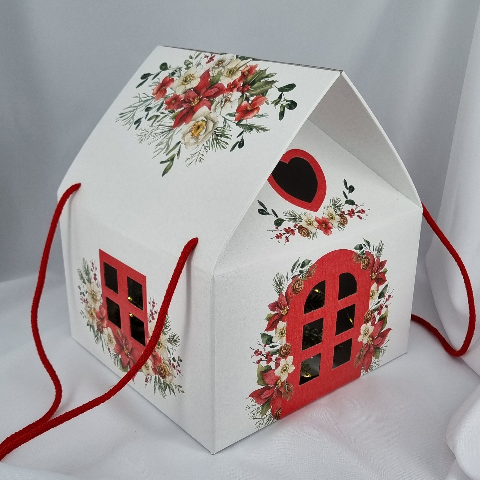 A házikó formájú doboz méretei:  szélesség: 24,5 cm; mélység: 24,5 cm; magasság: 28 cm