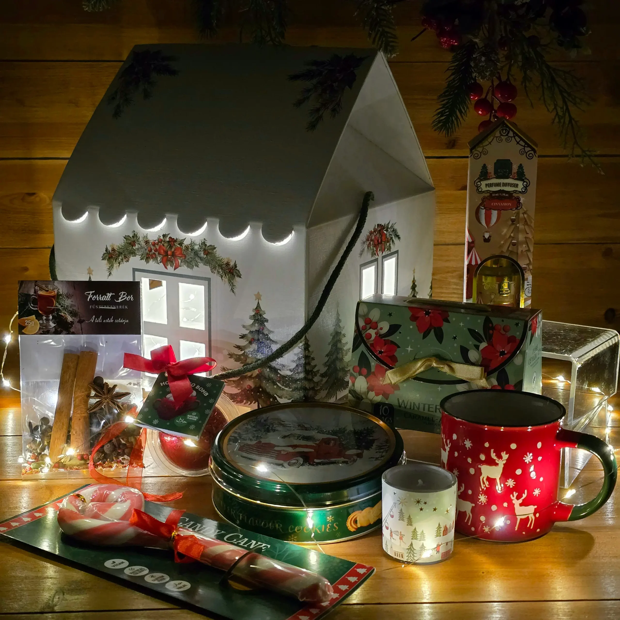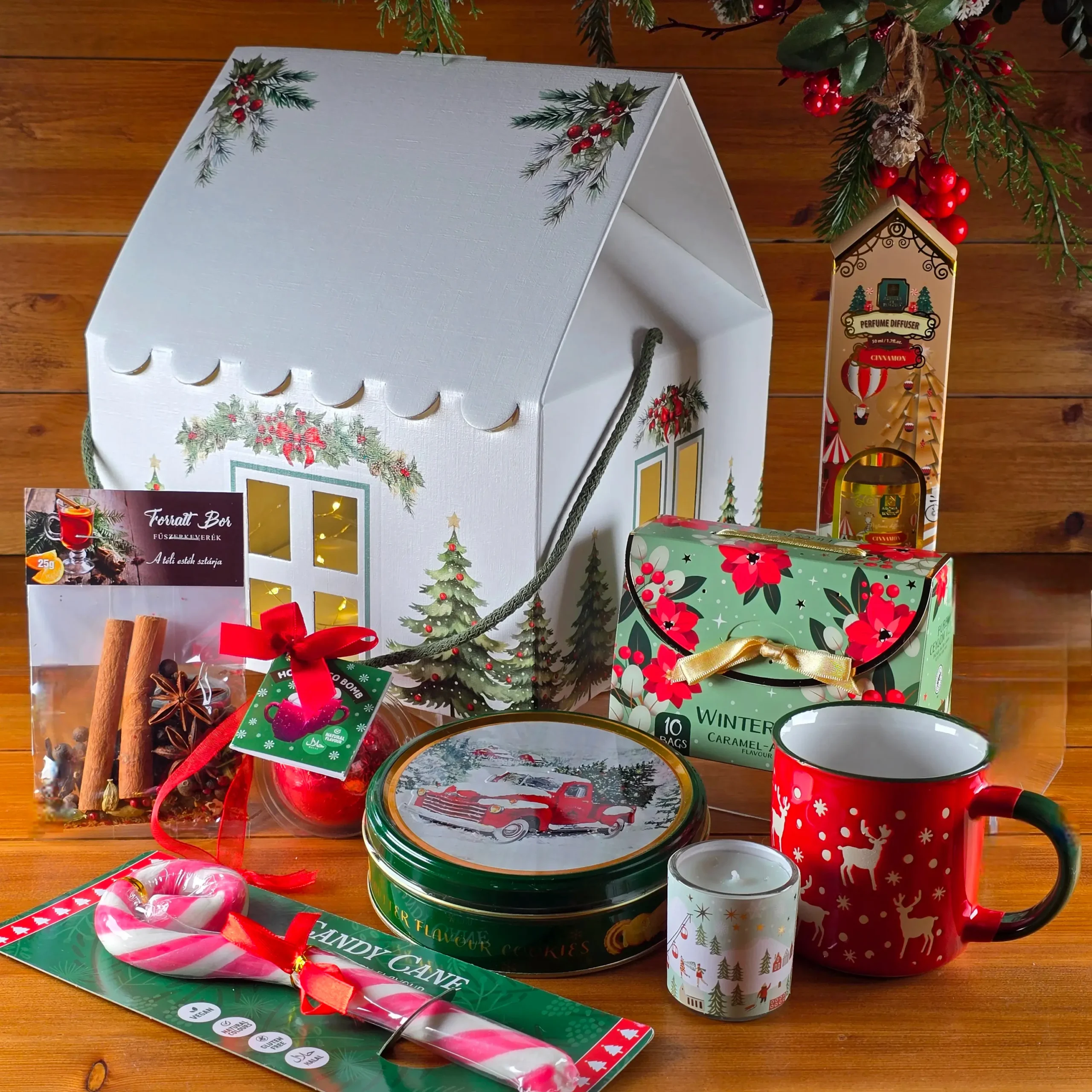 Karácsonyi házikó ajándékdoboz – bögre, gyertya, forraltbor fűszerkeverék, forrócsoki, tea, keksz, candy cane és aromadiffúzor egy csomagban.
