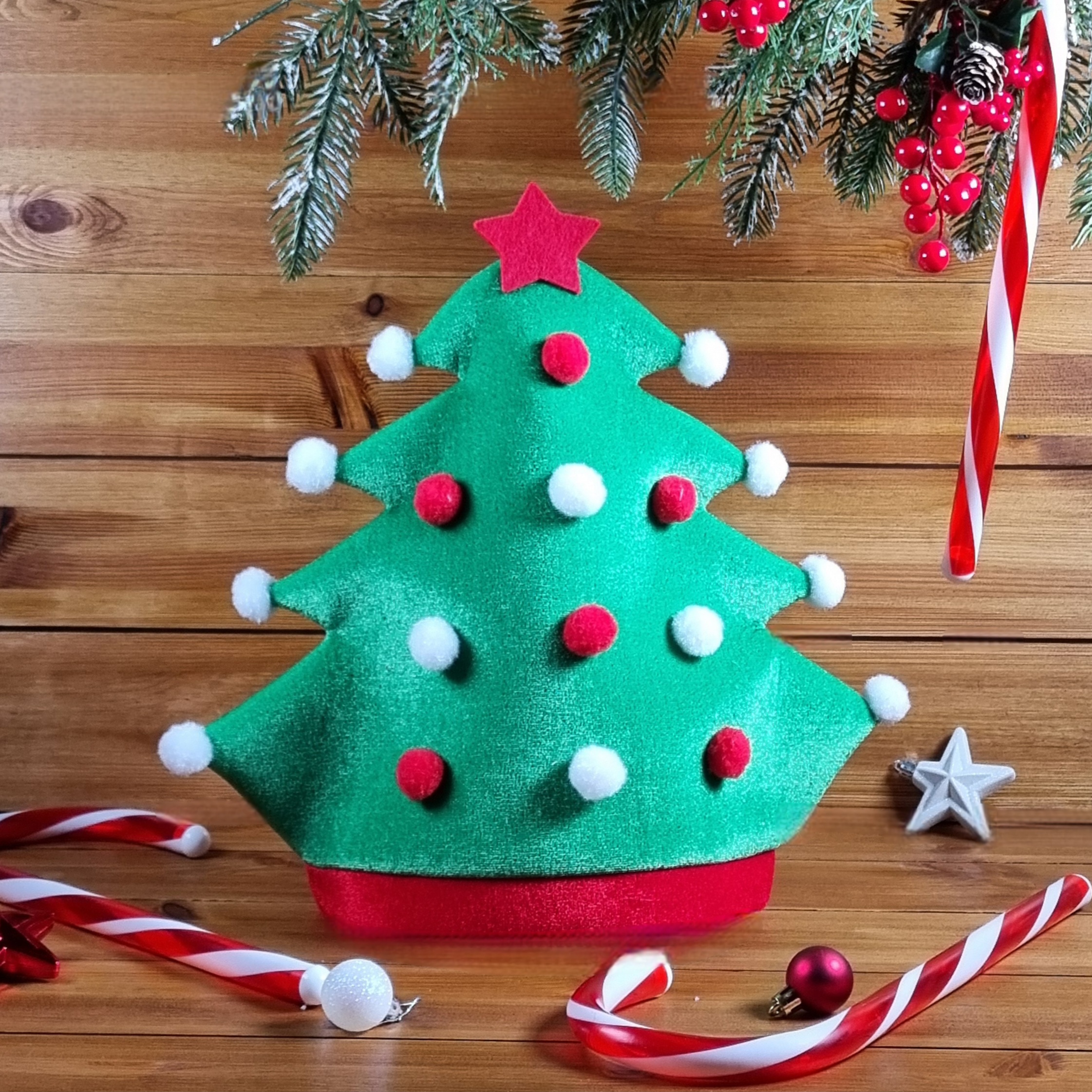 Készen áll a karácsonyi bulira? Ez a mókás karácsonyfa mikulássapka garantáltan feldobja az ünnepi hangulatot! Puha, kényelmes filc anyagból készült, és díszes piros-fehér pomponokkal, valamint egy csillaggal van díszítve a tetején. Akár a családi összejövetelen, a céges partin vagy egy baráti esten viseli, biztosan a figyelem középpontjába kerül. Készüljön fel a nevetésre és a jókedvre!